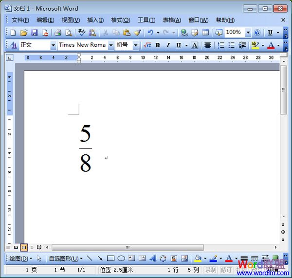 ③双击“\F(,)”,然后在下面的方框中的“\F(,)”,逗号前面输入5,逗号后面输入8(表示八分之五),然后依次确定,此时,分数就已经出现在Word文档中了。