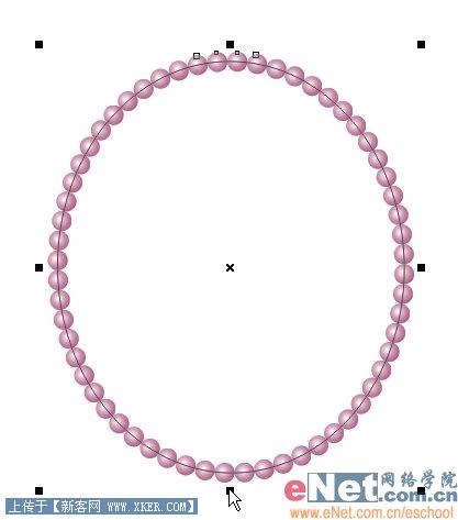 4、用椭圆工具画一个椭圆作为新路径。用交互式调和工具选中珍珠,在属性栏上点“新路径”,鼠标会变成弯曲的箭头状。