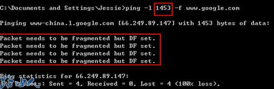 (1)点击开始-程序-附件-命令提示符,输入命令ping –l 14xx –f www.google.com,l 14xx参数的意思是发送一个定长数据包,14xx是要测试的包大小。