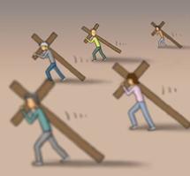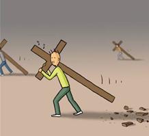 第一幅漫画中,每个人都背负着一个沉重的十字架,在缓慢而艰难地前行!